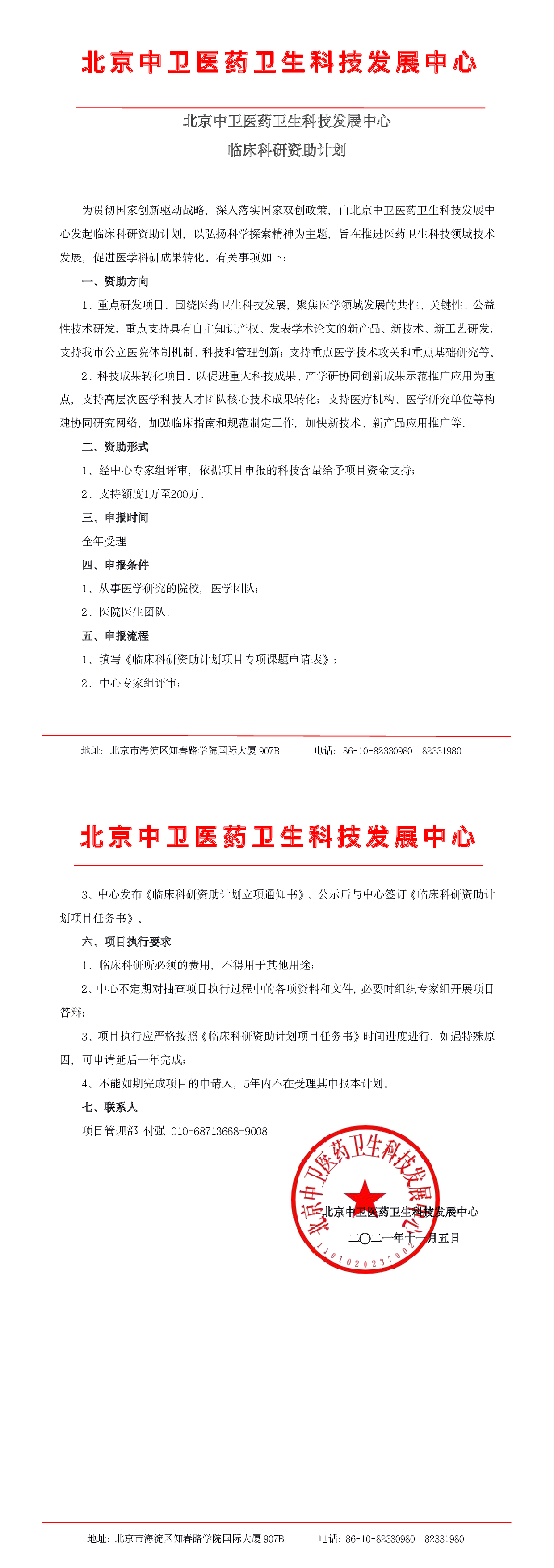 北京中卫医药卫生科技发展中心-临床科研资助计划 | |||||
